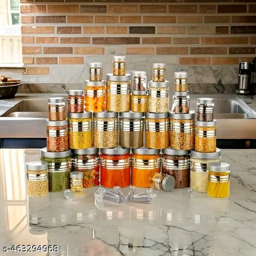 Upgrade your kitchen storage with this Premium 24-Piece Line Printed Storage Container Set, complete with 24 free spoons. The set includes containers of various sizes (1200ml, 650ml, 350ml, 250ml), perfect for organizing grains, spices, snacks, and more. Made from BPA-free material, these silver-clear containers are durable, airtight, and stylish, keeping your food fresh